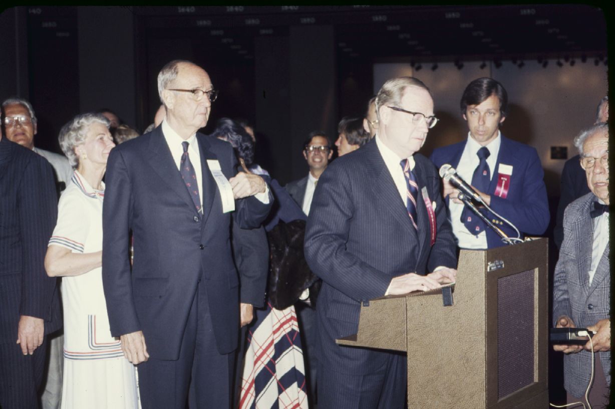 Man speaking at the podium at the dedication of the Thomas Jefferson statue at the MWE. ; April 14, 1976