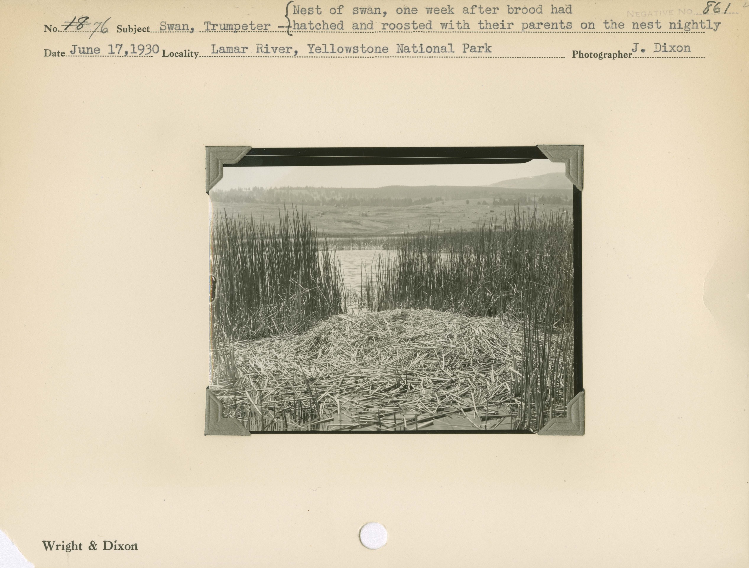 Swan, Trumpeter -- Nest of swan, one week after brood had hatched and roosted with their parents on the nest nightly. Locality: Lamar River, Yellowstone National Park. Negative #: 861