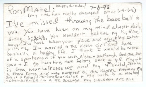 Business card for David J. Matel, Career Rehabilitation Counselor at the Minnesota Department of Jobs and Training. Left with a worn baseball and glove left for Ronald James Matel (KIA 06/09/1969) by his brother, David Matel.