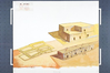 Split panel illustration depicts a diagram of overlapping foundations of First Village and Second Village; an artist's conjectural reconstruction of Second Village as it may have appeared about 1258 CE (Common Era);