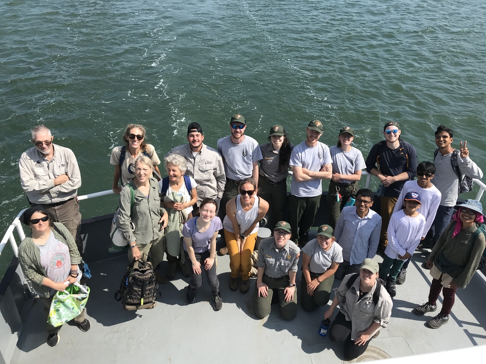 A group of volunteers and NPS staff members smiling together on the stern of a boat. Heading back home after another Stewardship Saturday on Thompson Island, August 27th, 2022.