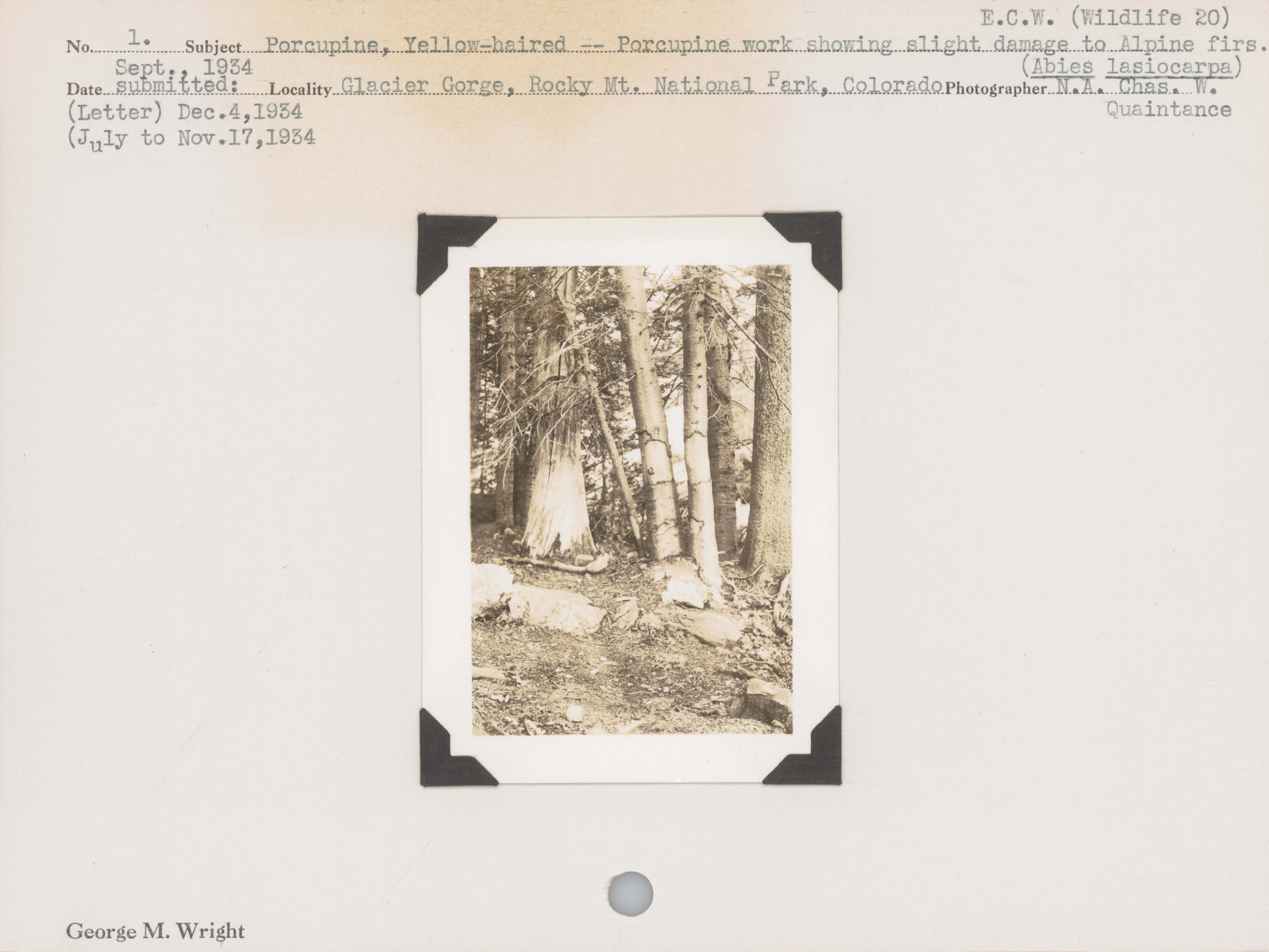 Porcupine, Yellow-haired--Porcupine work showing slight damage to Apline firs. (Abies lasiocarpa). Locality: Glacier Gorge, Rocky Mountain National Park, Colorado. Negtive #: ecw (wildlife 20). [Emergency Conservation Work]. (Letter) December 4, 1934. (July to November 17, 1934)