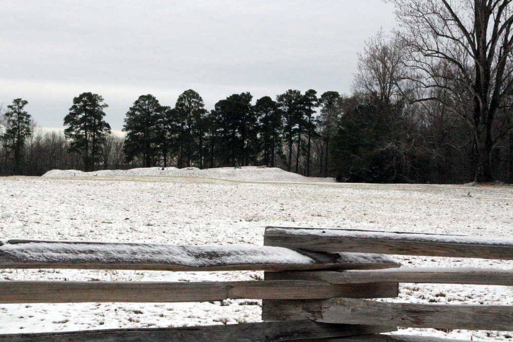 A split rail fence in the foreground with an open lawn covered in snow and Battery 5 on the horizon.