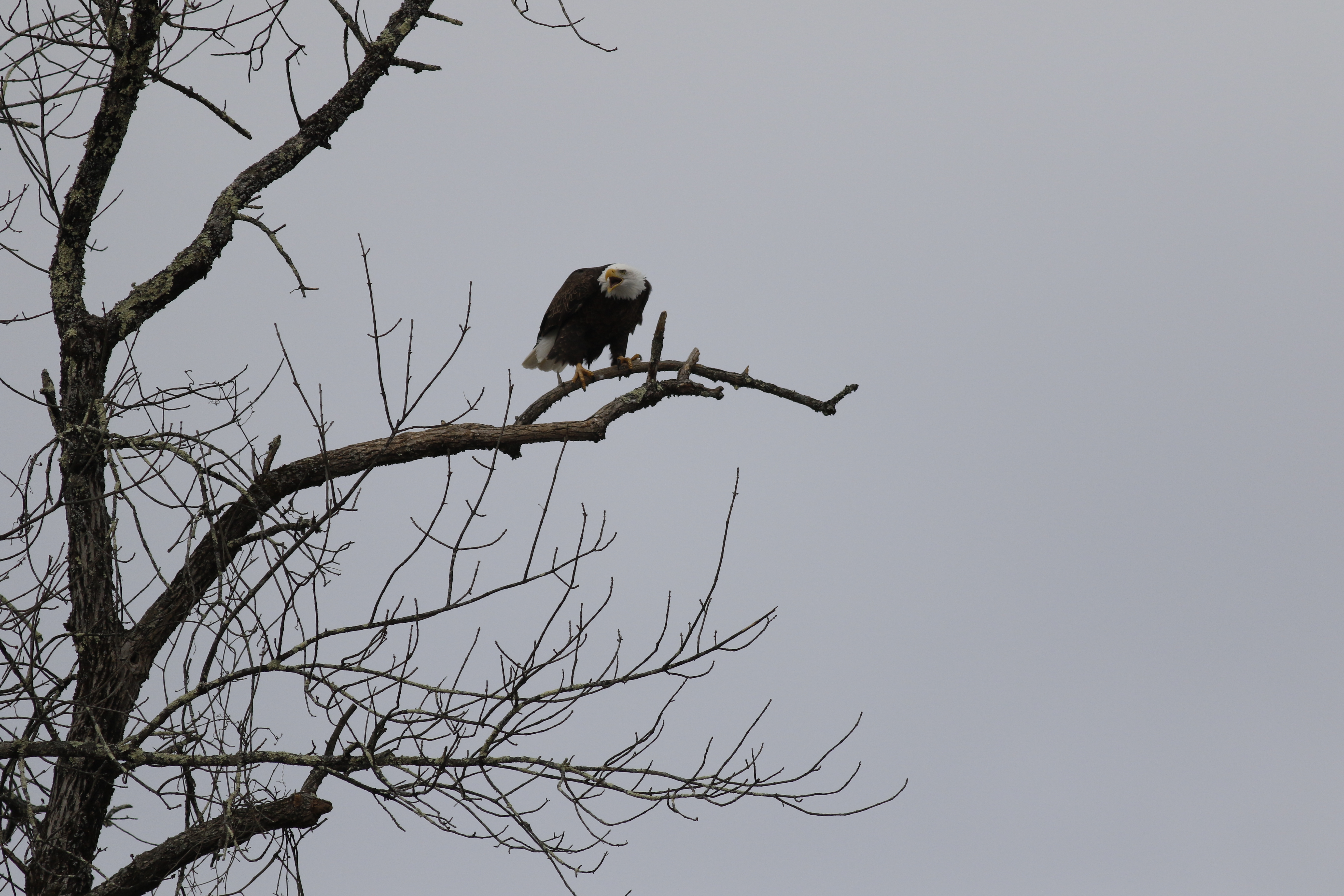 Bald eagle perched on a bare tree branch. Eagle faces camera, slightly hunched, beak open in mid-screech. Its body and folded wings are dark brown, almost black. Its head and tail are white. Its beak and legs are yellow.