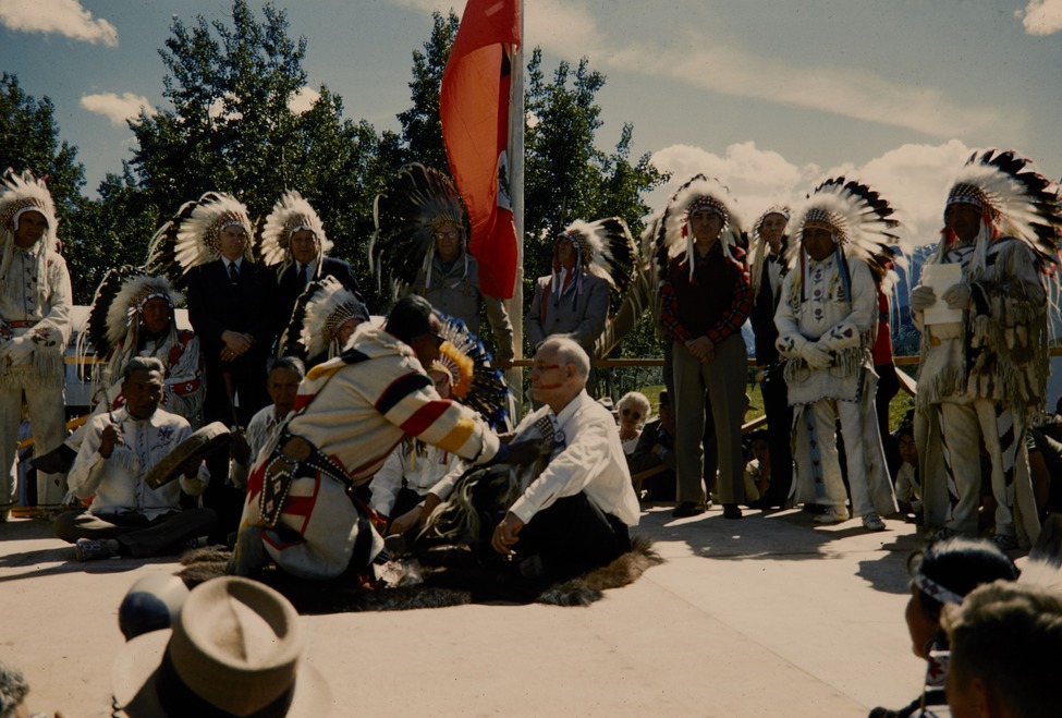 Native Americans painting a man's face during a Blood Indian ceremony in Glaicer National Park.