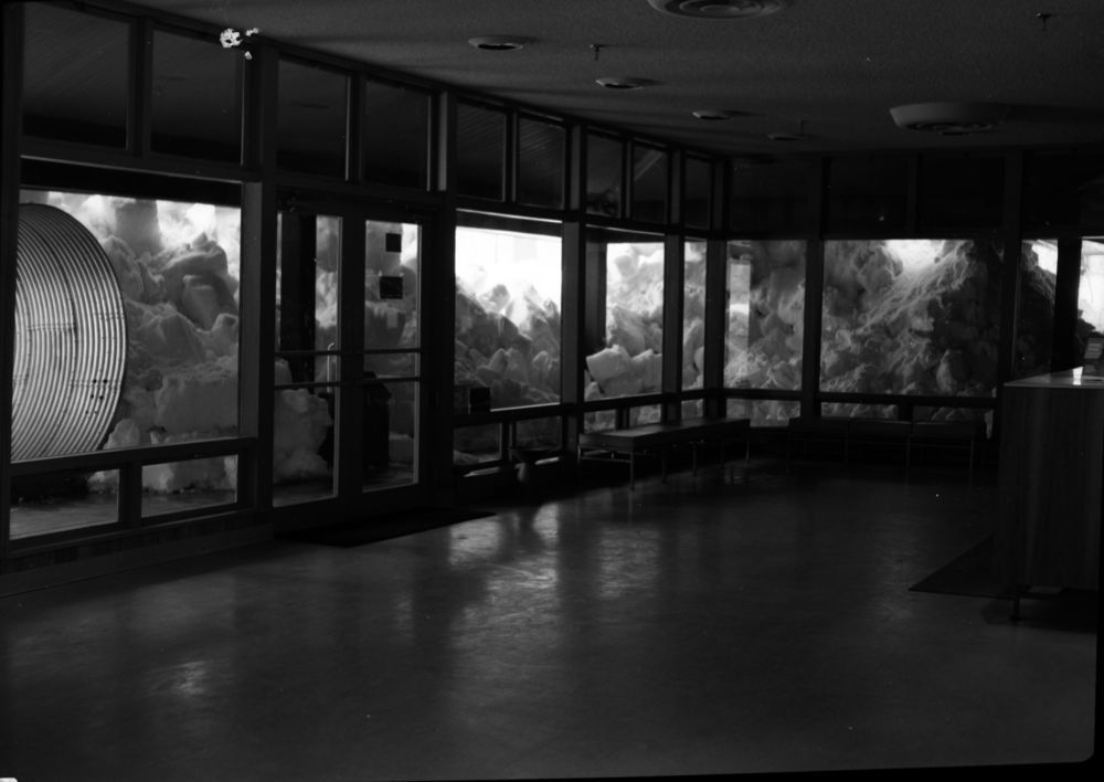 Robert Zink, Grant Grove, KCNP, Record Heavy Snows, Snow conditions at Visitor Center after storm of February 4, 5, 6. 690208.