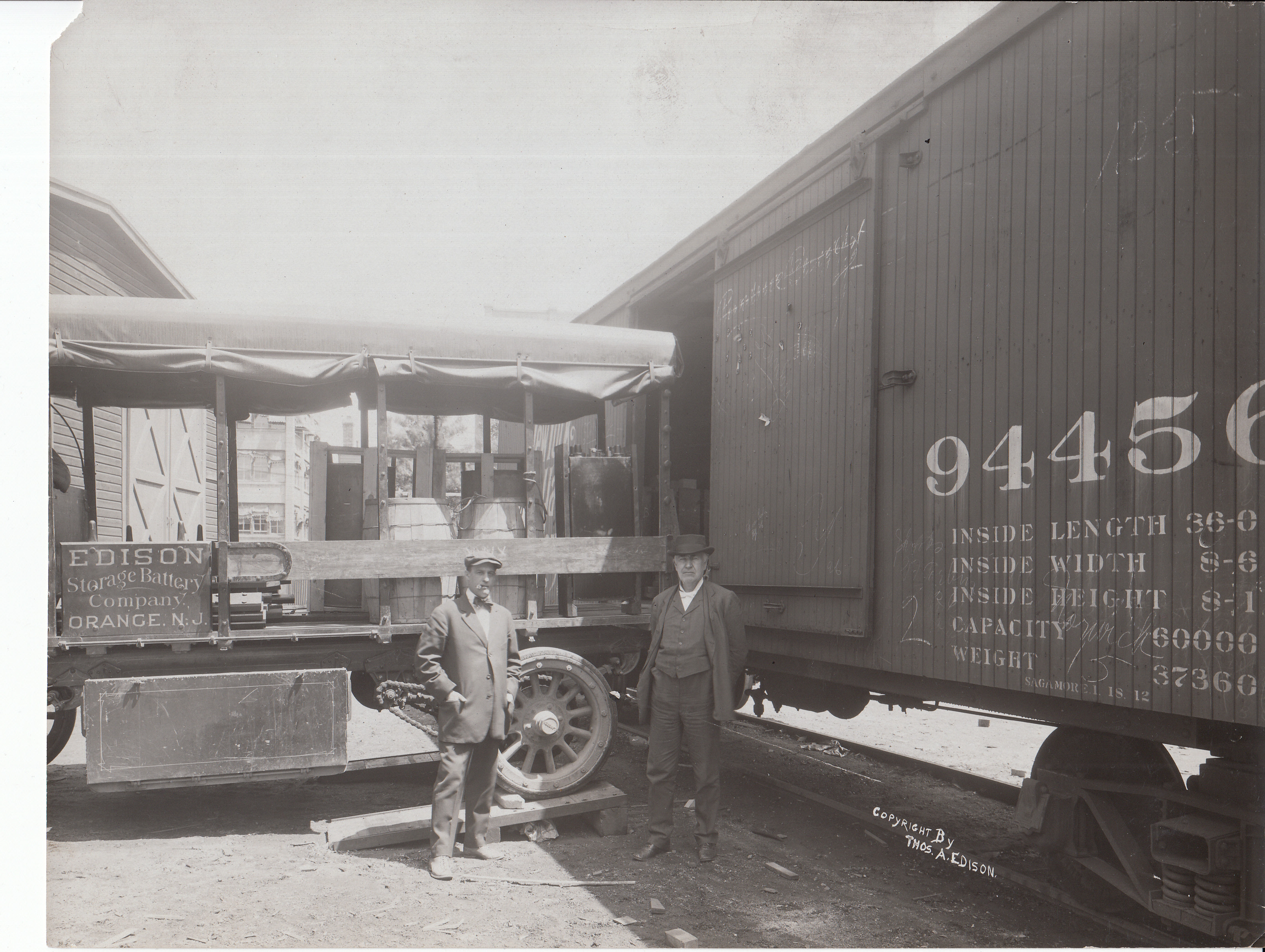 Thomas Edison beside railroad car with storage battery shipment, Miller Reese Hutchison on left.