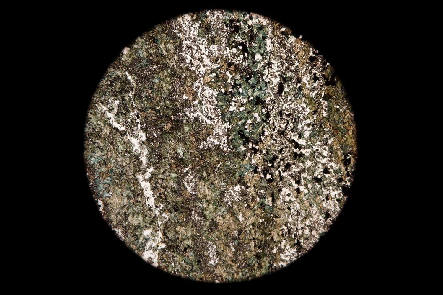Circular microscopic image of rock structure.