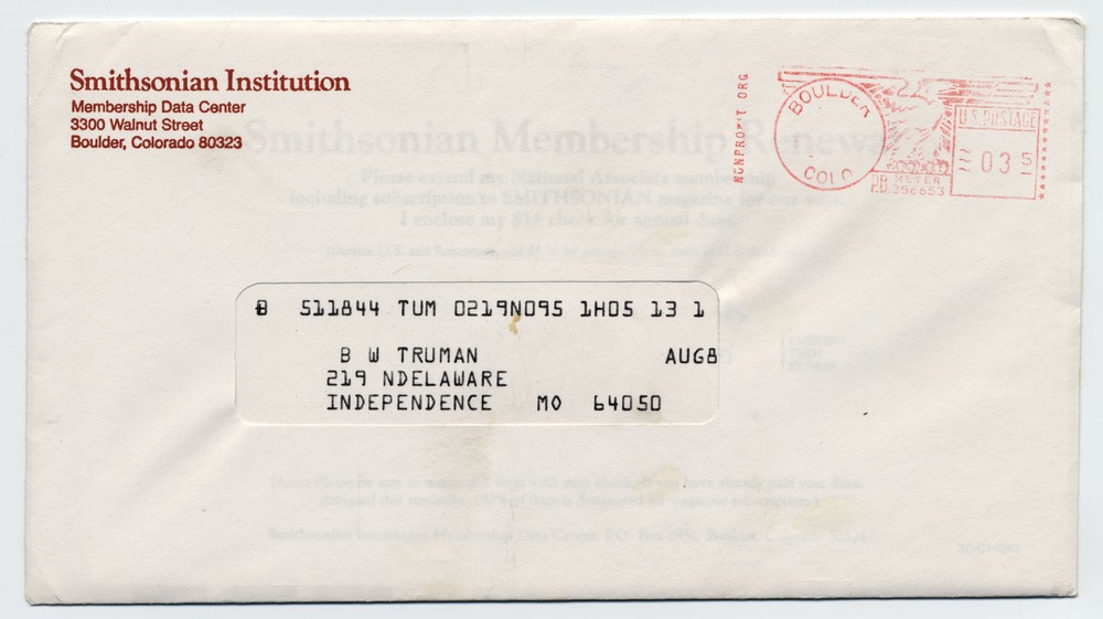 An unopened letter from the Smithsonian Institute to Bess Truman. On the envelope is the address of the Smithsonian's Membership Data Center in Colorado.