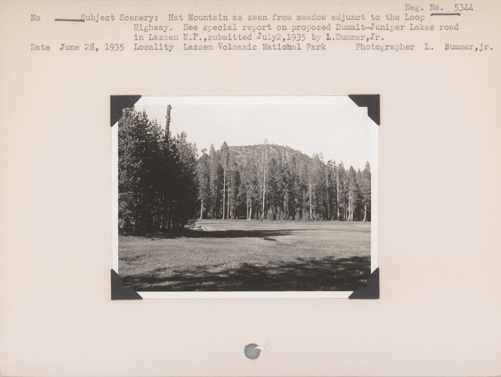 Scenery: Hat Mountains as seen from meadow adjunct to the Loop Highway. See Special Report on proposed Summit-Juniper Lakes Road in Lassen National Park, Submitted July 2, 1935. Negative #: 5344. Locality: Lassen Volcanic National Park, California.
