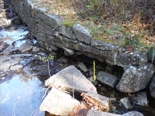 Mill Field Reservoir Spillway. Failing stone wall in the spillway outlet. 2013