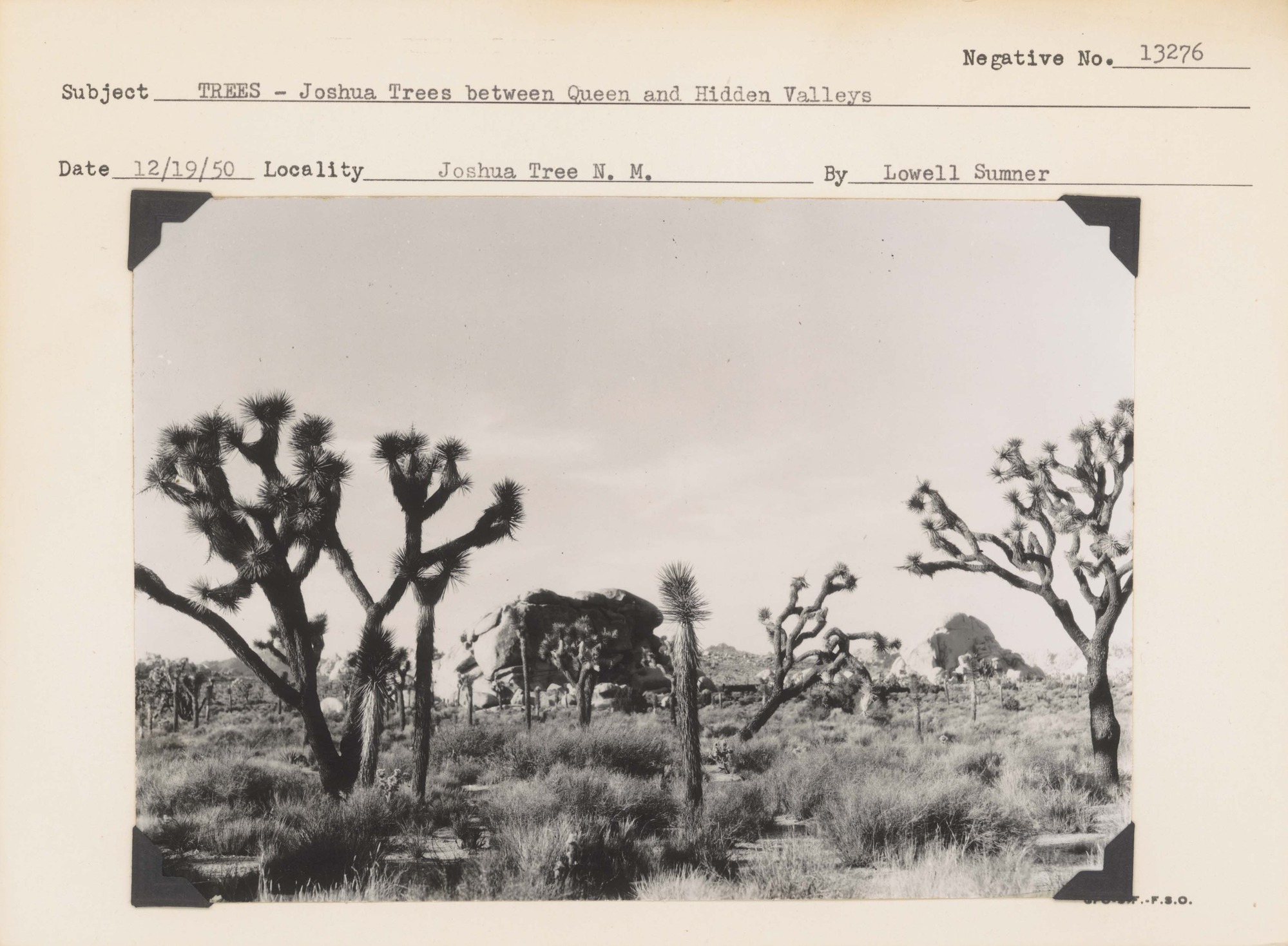 Trees: Joshua trees between Queen and Hidden Valleys. Negative #: 13276. Locality: Joshua Tree National Monument.