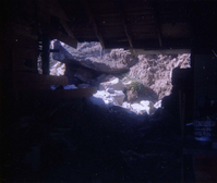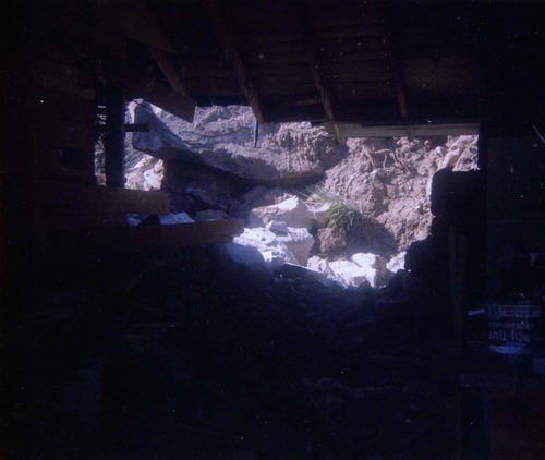 Color photo of rock slide in maintenance yard. ; ZION Museum and Archives Image 107_06_04005 ; ZION 15933