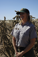A woman in the National Park Service maintenance uniform stands for a photo. Desert cactus and shrubbery extend into the background meeting white sand dunes under a clear light blue sky.