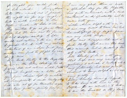 I was thankful it cleared into such a lovely afternoon, sunny & warm, with a very soft, south wind, [p. 2] I thought you would find it hot inland. Tom drove later than usual, & as I feared the night air for any cough, I took a walk instead to the Willow-beach, with Edie & Annie. They wanted to go as far as Bailies Hill, but the sun was too powerful & supper waiting. So Edie would not return with me, but lingered behind with very valiant intentions of an independant [sic] promenade, - soon put to flight by wandering cows.
