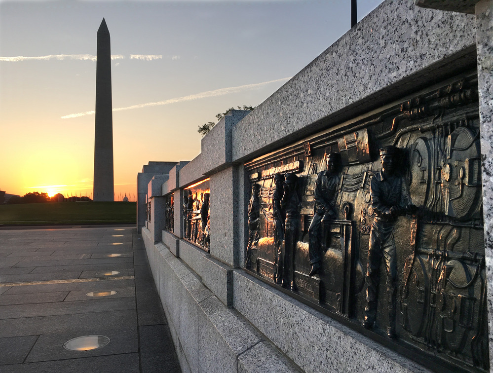 Dark, bronze, rectangular panels set into a light stone wall that stretches from the bottom right to the center of the photo, in the direction of the Washington Monument, a tall obelisk in the distance. The sun is on the horizon to the left of the monument.
