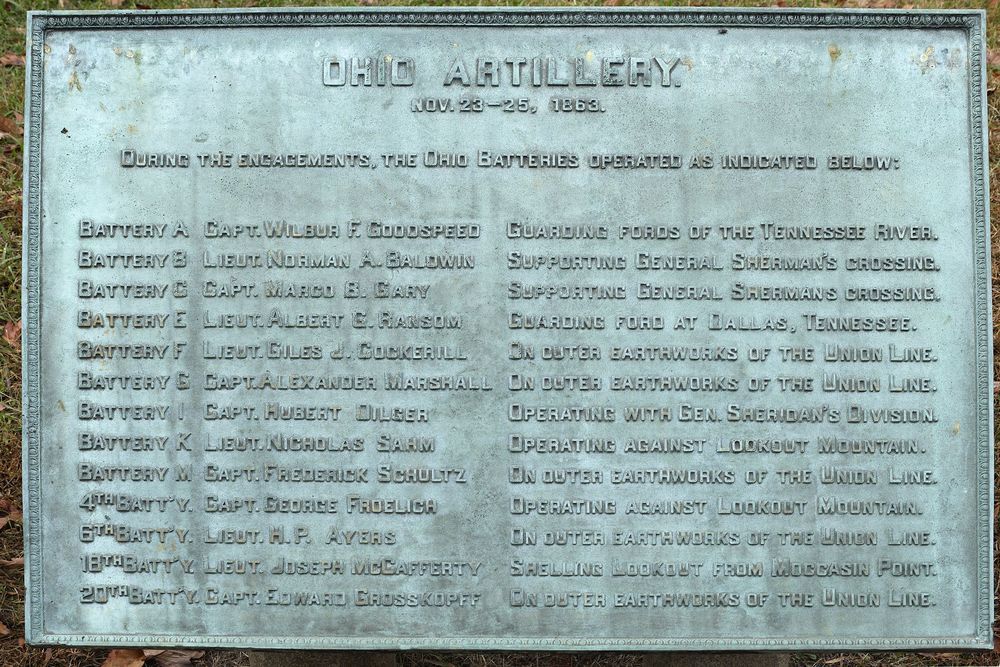 Marker contributes to national significance of park under NR Criterion A because it represents the national movement among veterans & related groups to commemorate Civil War battlefields. || 4' x 3' bronze inscription tablet with decorative border mounted on two low marble pedestals. Describes activities of Ohio artillery units from November 23-25, 1863.