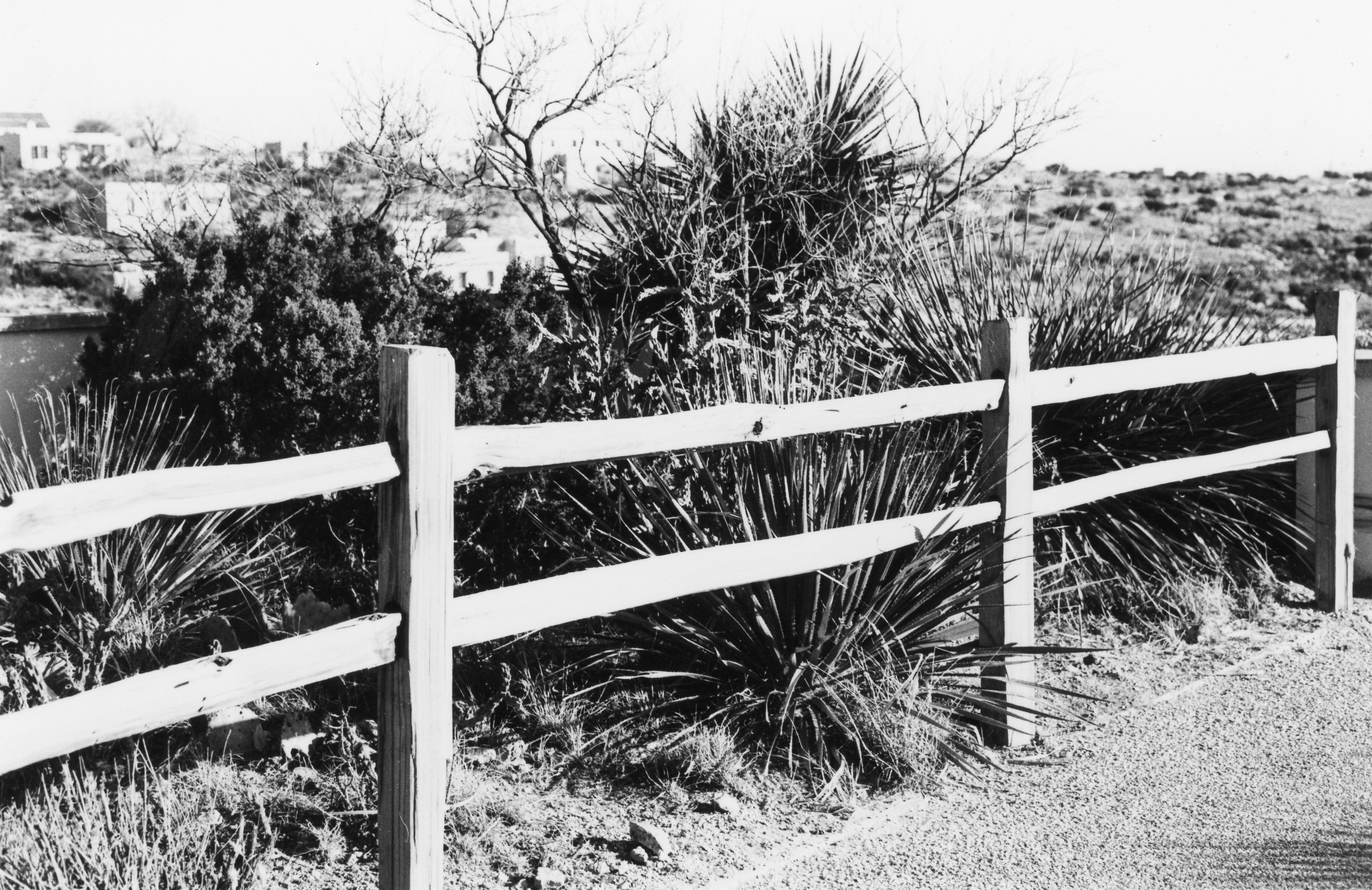 A black and white photograph of a wooden fence and desert shrubbery. The ranger residences can be seen out of focus in the background.