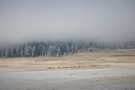 A herd of elk grazing in the distance near a forest of frosty trees and fog hovering overhead.