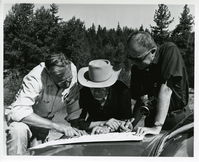Three men looking over a map layed out on the hood of a car. Coniferous tree line in the background.