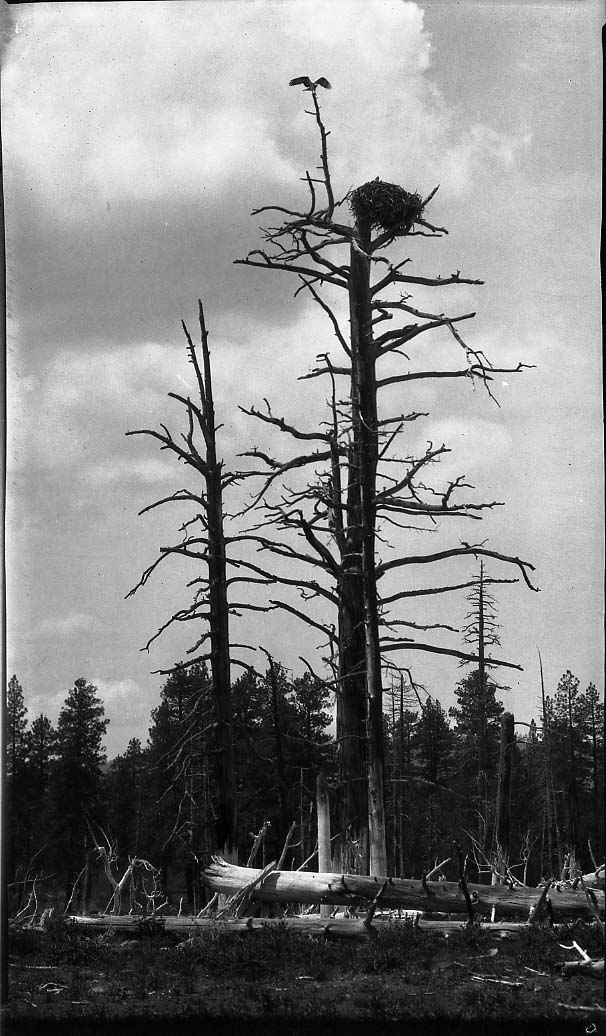 Osprey, Eagle Lake, Lassen Co, Calif, May 24, 1925, Male osprey on nest, female just slighting