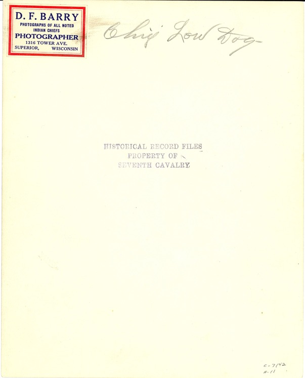 LIBI_00011_07142; A sepia-toned photograph of Oglala Sioux Chief Low Dog; copyrighted D. F. Barry; Barry label on verso; created on unknown date. [note: Low Dog participated in Custer fight.]; PRINT, PHOTOGRAPHIC; Courtesy of the National Park Service, Little Bighorn Battlefield National Monument, LIBI_00011_07142, D. F. Barry, "Low Dog, Oglala Lakota," date unknown