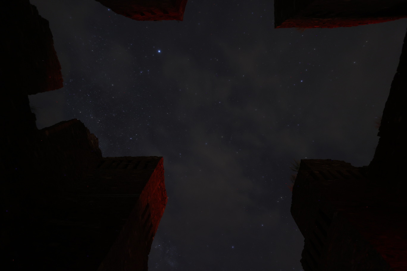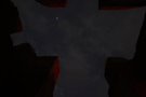 Dark sky photo with dark church remnants in the foreground.