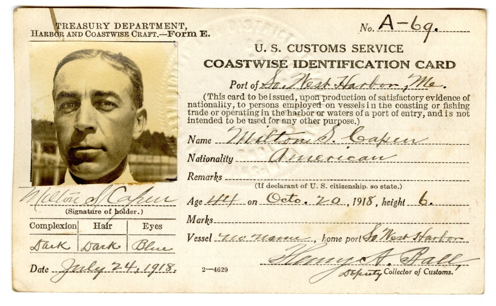 Coastwise identification card for Milton S. Capen. Card was issued at the Port of Southwest Harbor, Maine. His age was 44 as of October 20, 1918. His ship/vessel had no name and its home port was Southwest Harbor, Maine. The photograph adhered to the card shows a headshot only. Seal embossed on card reads, District of Maine & New Hampshire, Collector of Customs, Deputy, Port of Southwest Harbor, Maine. Nationality listed as American.