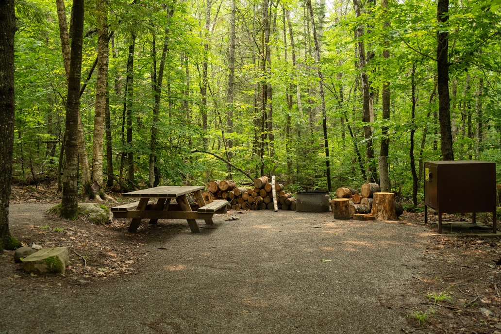 A picnic table, fire pit, and bear box in site 1 at Lunksoos campsites.
