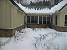 A significant snow, sleet, and ice storm (Feb 18-22, 2015) damaged and destroyed building's gutters and downspouts. This image is part of a PMIS Emergency Funding request.