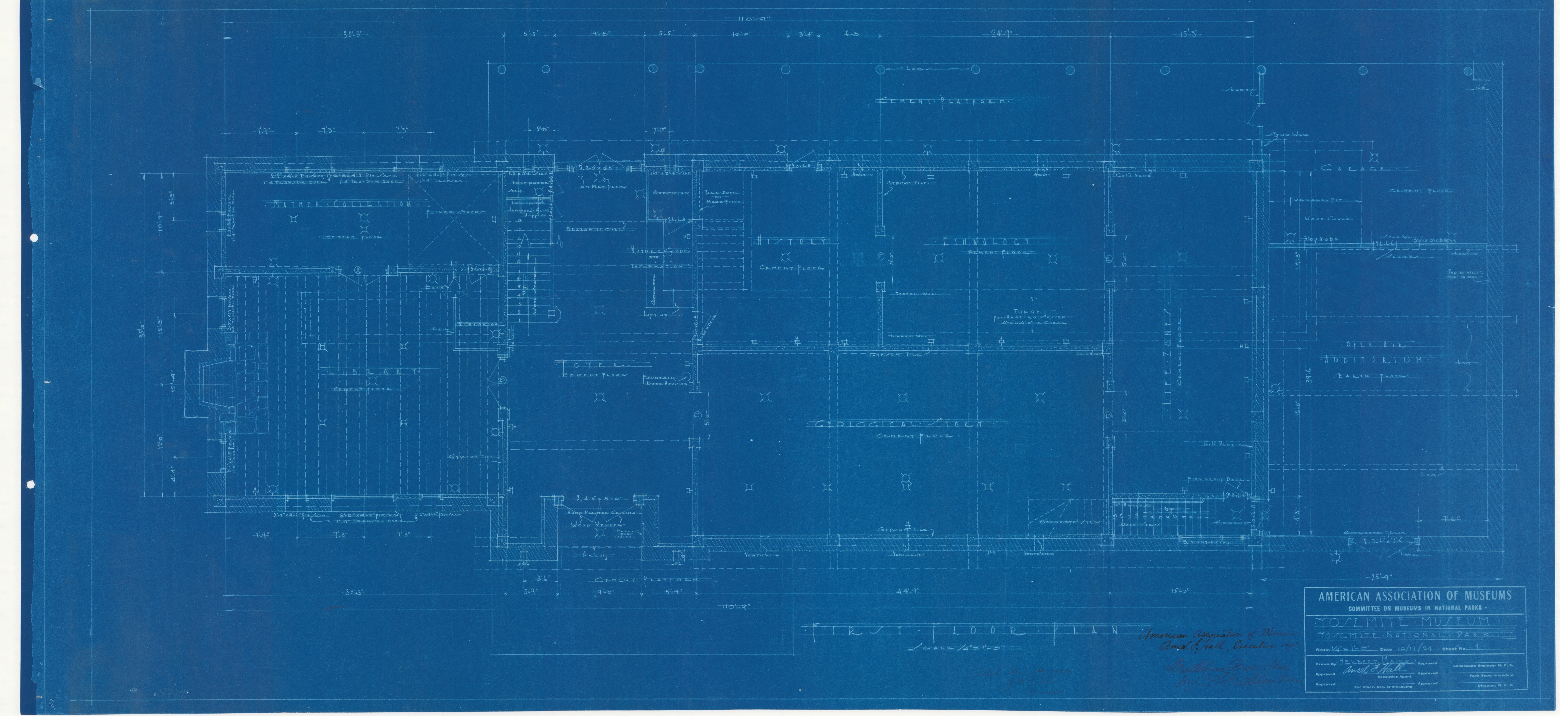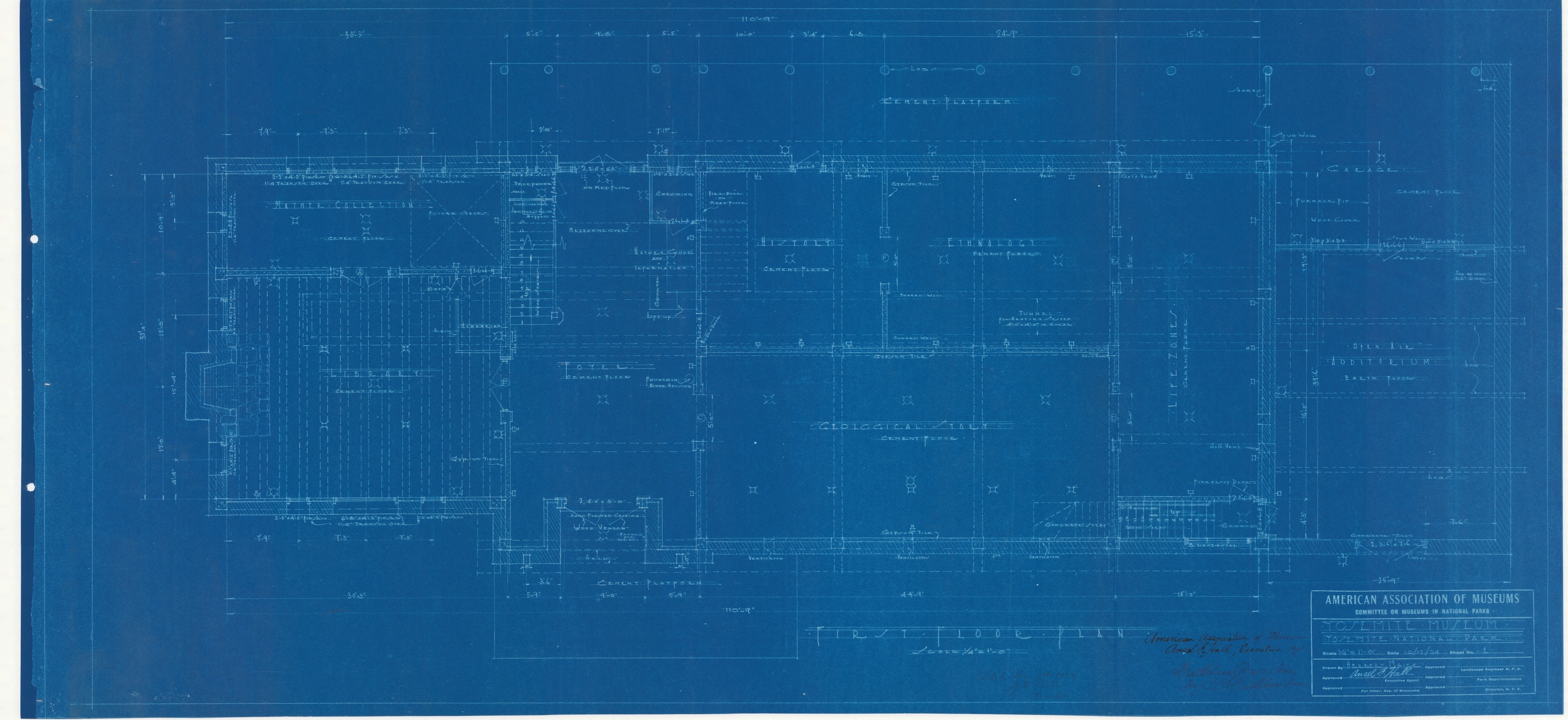 Blueprints showing first floor plan of Yosemite Museum, including rooms for library, Mather Collection, foyer, geological story, history, ethnology, life zones, garage, and open air auditorium, sheet 1
