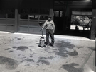 BW Photos of man standing next to maintenance equipment. Vehicle fuel pumps in foreground, equipment and dry sand hopper in background. ; ZION Museum and Archives Image 700_04_12005 ; ZION 15933
