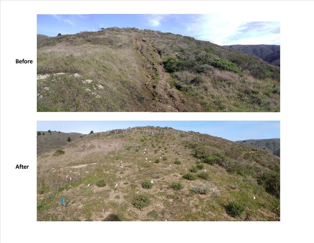 This project will improve the Dias Ridge Trail alignment and drainage to reduce erosion on Dias Ridge between the National Park Service, California State Parks, and the Golden Gate Dairy boundaries on State Highway 1 to protect the endangered species habitat of Redwood Creek. On Golden Gate National Recreation (GGNRA) lands, the project will restore 1.2 miles of poor existing trail alignment to natural conditions, including extensive revegetation, and construct 1.5 miles of new sustainable multi-use trail with proper drainage features, necessary retaining walls and a multi-use trail bridge.