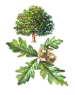 Complete Bur oak tree (Quercus macrocarpa) with an enlargement detail of four leaves and a seed cluster.