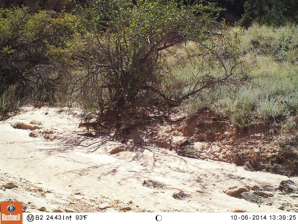 Small gray fox in middle of photo frame, below a shrub, grassy banks, and a sandy wash in front.