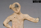 This Native American effigy has its left arm extended and right arm is flexed with hand on hip. Shoulders measures 7 cm across. No bodily features other than Occipital hair knot, eyes, nose and mouth.