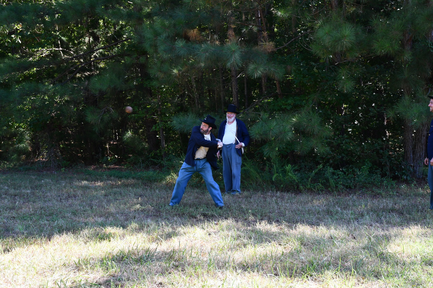 Living history volunteer portraying the 6th Wisconsin gets ready to hit a ball during a game of rounders.