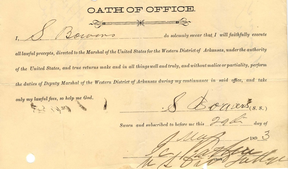 An aged slip of paper titled, "Oath of Office," with the signature of S. Bowers dated May 29, 1893. Text reads: “I do solemnly swear that I will faithfully execute all lawful precepts, directed to the Marshal of the United States for the Western District of Arkansas, under the authority of the United States, and true returns make and in all things well and truly, and without malice or partiality, perform the duties of Deputy Marshal of the Western District of Arkansas during my continuance in said office, and take only my lawful fees, so help me god.”