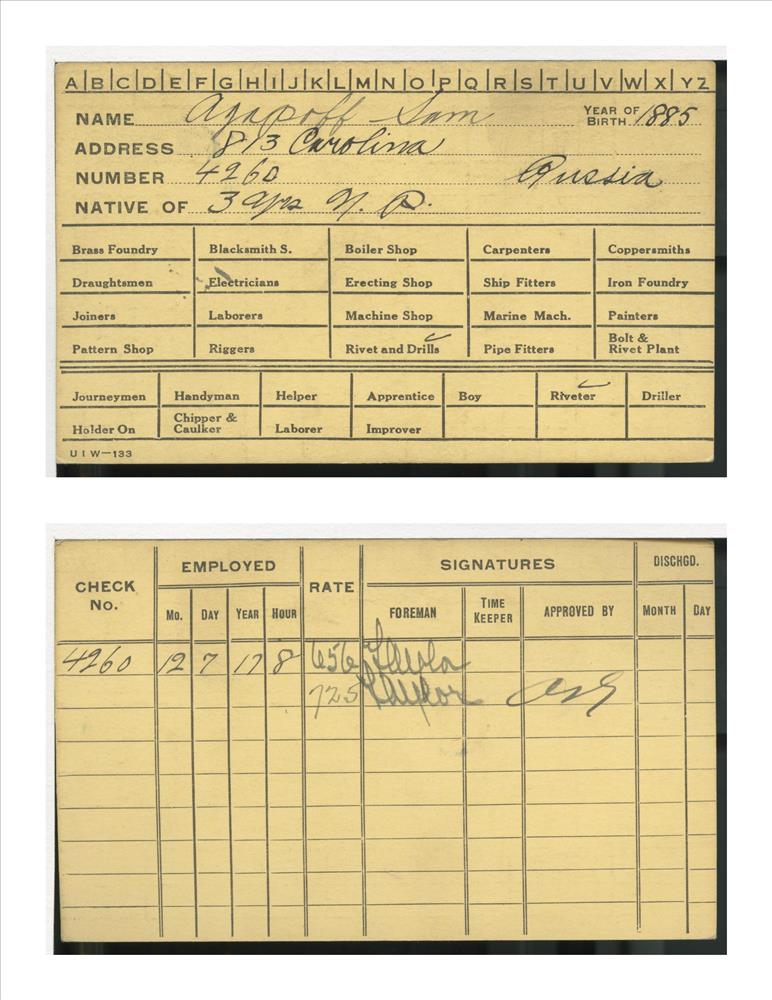Union Iron Works Co. employee card for Sam Agapoff