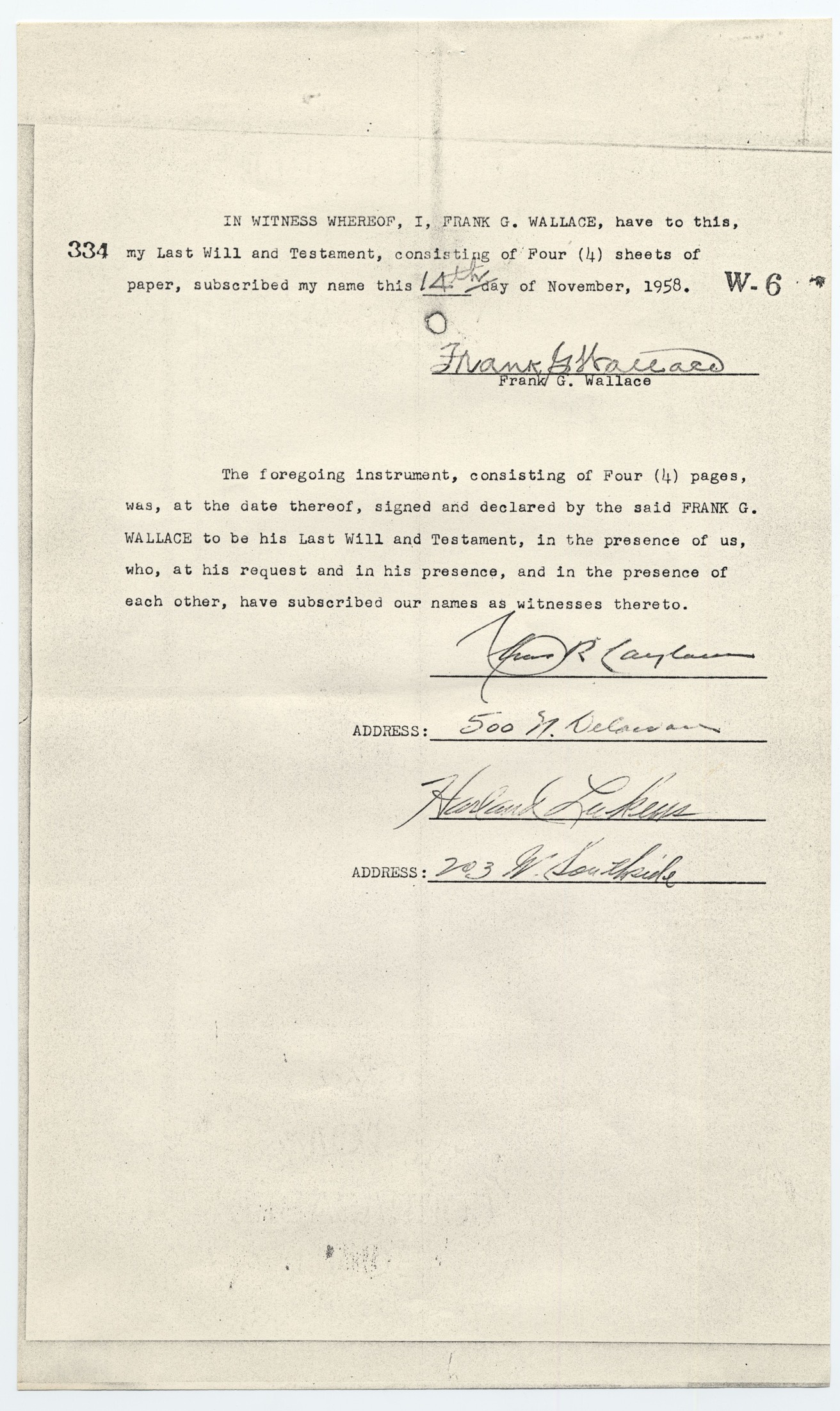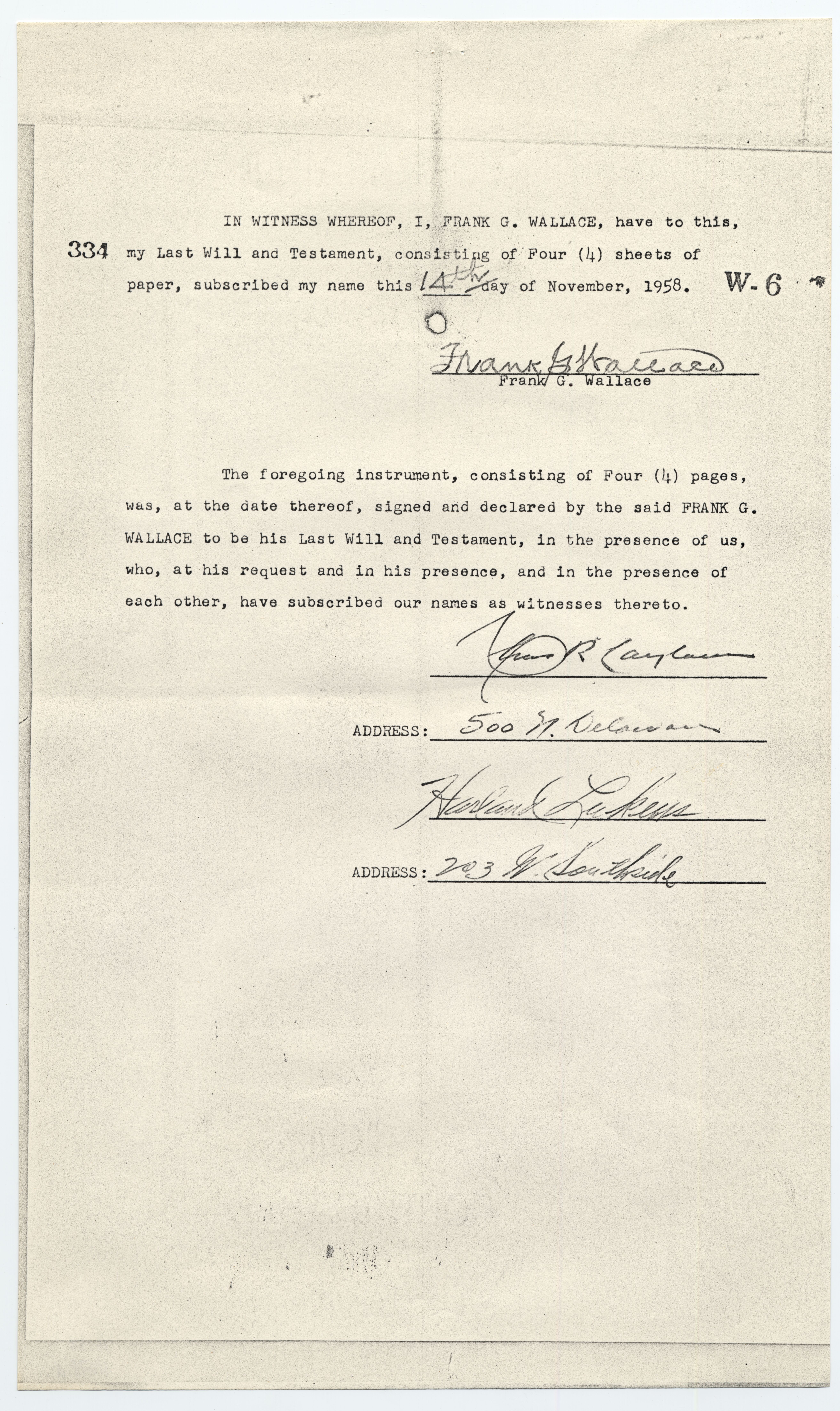 A copy of the Last Will and Testament of Frank G. Wallace. The will was completed on November 14, 1958. The will includes forms filed with the state of Missouri.