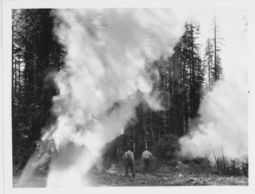 Administrative Collections: Album 2-Road clearing for construction of Lassen Park Road southwest approach showing timber and brush removal and burning.