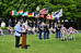 Soldiers and veterans and man at podium with multiple country flags flying.