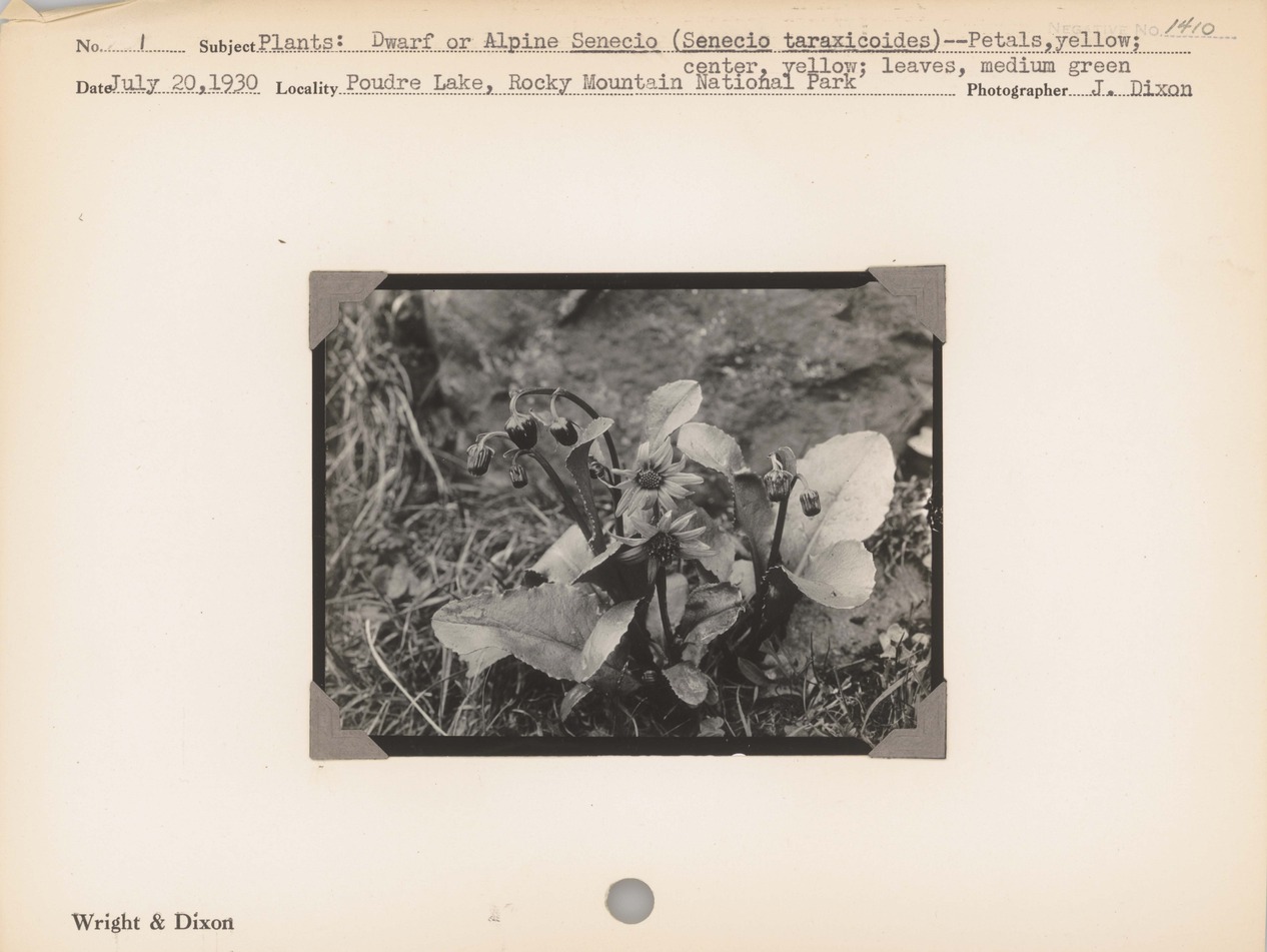 Plants--Dwarf or Alpine Senecio (Senecio taraxicoides)--Petals, yellow; center, yellow; leaves, medium green. Locality: Poudre Lake, Rocky Mountain National Park. Negative #: 1410.