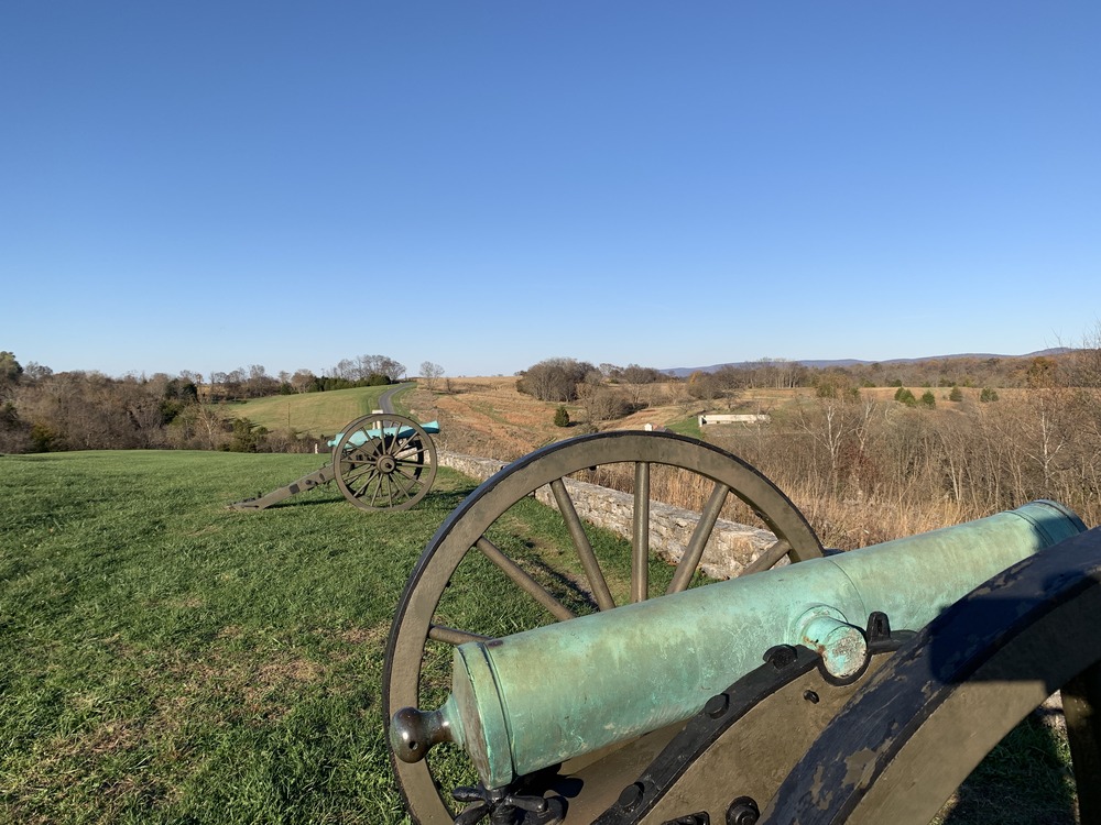 This view is looking north from the tour stop. Federal troops would have moved right to left across this photo. the Sherrick barn is visible above the cannon wheel in the foreground.