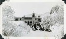 This is an historic black and white photograph from the Scotty's Castle Historic Photograph Collection, Death Valley National Park of snow covered branches to large Spanish style building with arched front porch. Central foreground white. Snow covered hill behind. Inscriptions in black ink along upper and lower border.