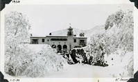 Looking north through snow covered branches at Scotty's Castle Main House south façade. January 7, 1930. Photographed by Mat Roy Thompson. Excavation for pool provides opening in center to see the Main House Front Porch. Inscription in black ink, bottom right: 5" Snow. In black ink, bottom left: 1-7-30. Number in black ink at top left refers to historic photograph numbering system: 1960. Black and white, horizontal format, 3 x 5 inch. Corner mounted on photograph album page.