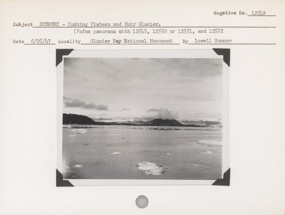Scenery: Cushing Plateau and Muir Glacier. (Forms panorama with 1248, 12550 or 12551, and 12552). Negative #: 12549. Locality: Glacier Bay National Monument.