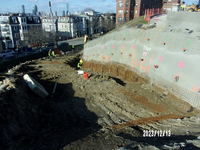 Steel mesh and smaller rebar pilings are installed on the hill side and then covered with sprayed concrete. This stabilizes the face of the hillside and forms a foundation for the eventual poured retaining walls.