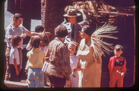 A woman in American Indian attire stands with a basket weaving in a demonstration to a group of visitors. A male park ranger stands to her right.