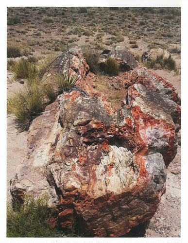 a photo of a a large piece of reddish-tint petrified wood sitting in a desert.